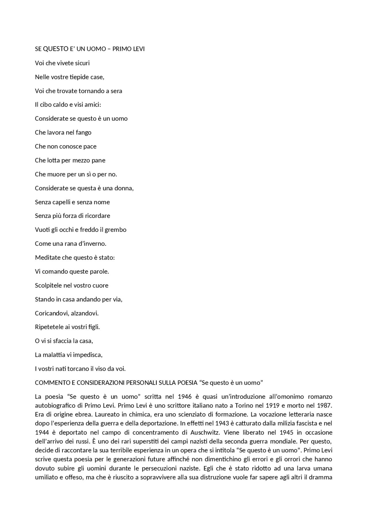 Se questo è un uomo riassunto letteratura italiana contemporanea UNICAL Studocu